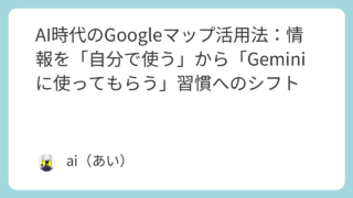 仕事効率化 AI時代のGoogleマップ活用法:情報を「自分で使う」から「Geminiに使ってもらう」習慣へのシフト GoogleマップとGeminiを連携させ、リサーチや判断をAIに外注する仕事効率化術を解説。Yahoo!、NAVITIME、YAMAP等の使い分けから、片手ズーム等の時短Tipsまで。移動を自由時間に変えるための情報の整理・活用法をまとめました。 仕事効率化